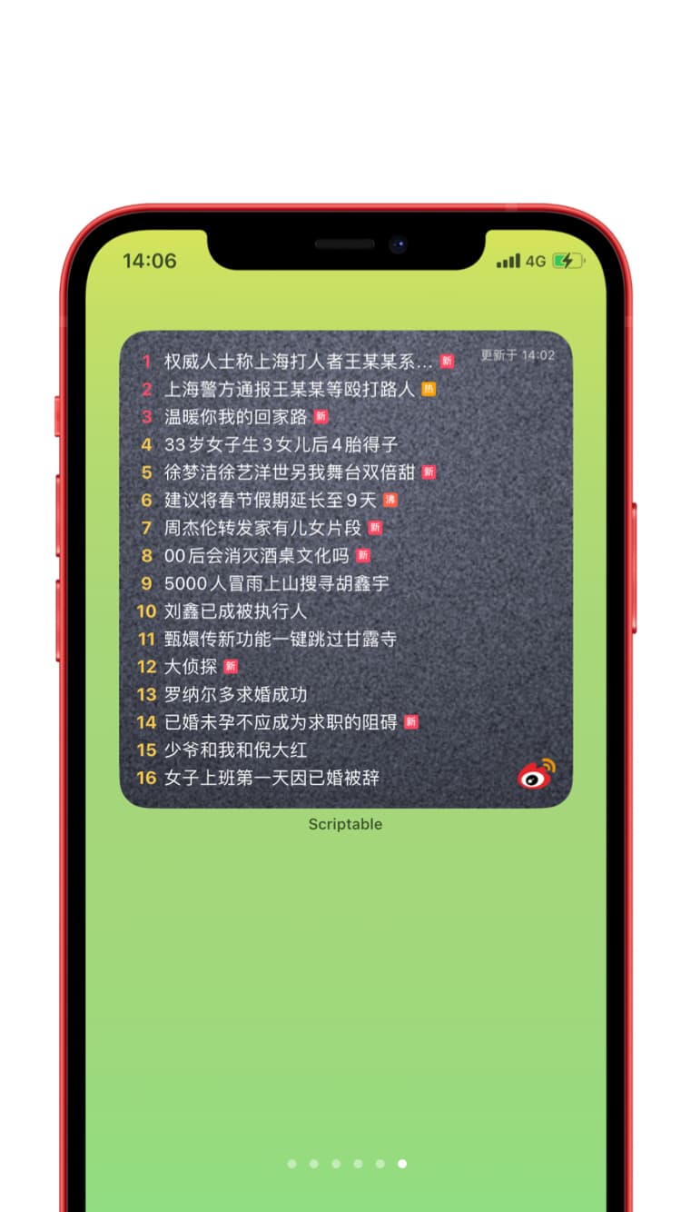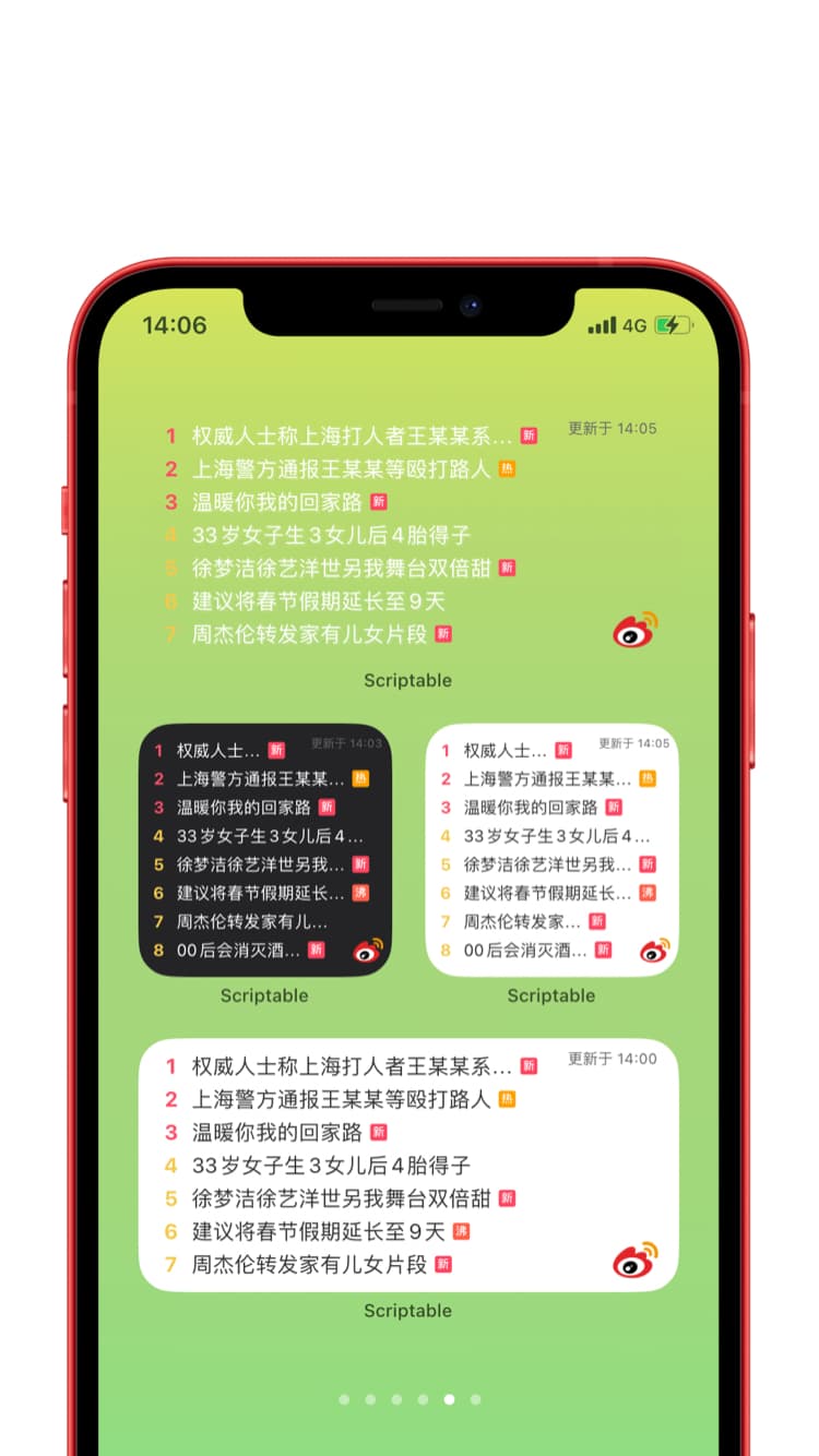 微博热搜小组件 - 支持中英双语 - 可自定义背景、色彩和尺寸等 编辑小组件时填入 `dark` 或 `light` 可固定为深/浅色模式